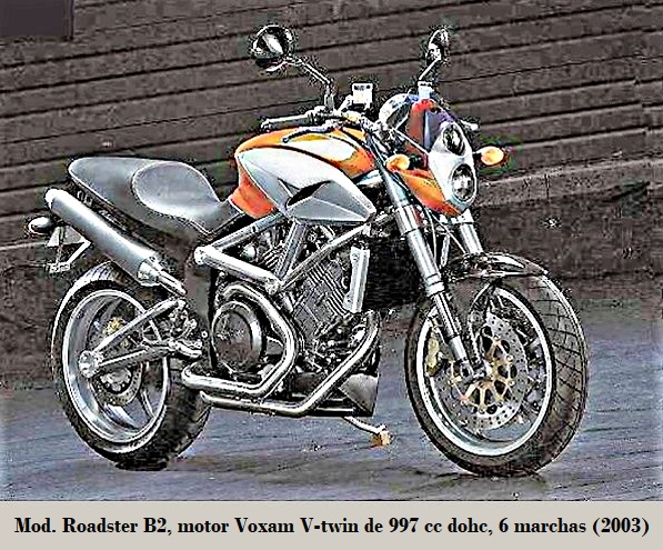 • Roadster B2: motor Voxan V-twin de 997 cc a 45º dohc, refrigerado por aire / aceite, 6 marchas, bastidor multitubular, suspensión D/T horquilla invertida / basculante con monoshock, {frenos de disco Bembo} D/T. 2003