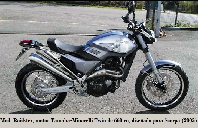 • SCORPA 660 Raidster: motor twin paralelo Yamaha-Minarelli de 660 cc, diseñada en 2005 para Scorpa