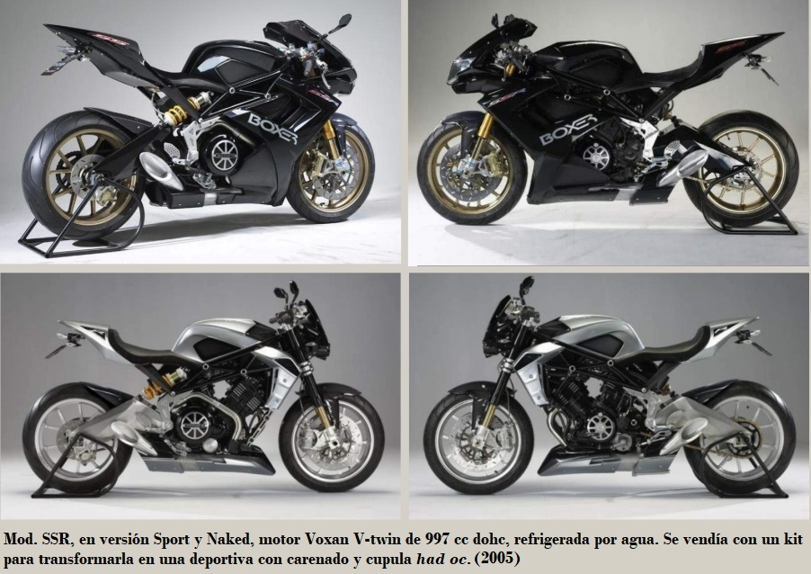 • SSR: motor VOXAN {V-ttwin} de 997 cc dohc, 6 marchas, encendido electrónico CDI, arranque eléctrico, suspensiones D/T horquilla invertida Öhlins / basculante con monoshock Öhlins, frenos de disco Brembo D/T (2) pinzas flotantes (2 pistones) / 1 pistón, llantas Marchesini D/T, neumáticos tubeless D/T 120 - 70-17" / 190 - 50-17" y 180 kg. En el precio de compra incluía un kit para vestir la versión "naked" y transformarla en una deportiva, con carenado, colín y cúpula ad hoc. Producción 300 unidades. 2005