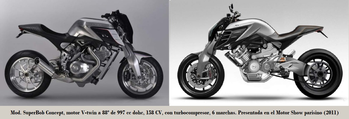 • SuperBob Concept: motor ³ V-twin a 88º de 997 cc dohc, 158 CV, con turbocompresor (6-9 psi), escape 2 en 1, bastidor monocasco de carbono, basculante monobrazo con monoshock Öhlins, frenos de disco Brembo D/T, llantas Marchesini, escape 2 en 1, transmisión final mediante correa y 199 kg. 2011
