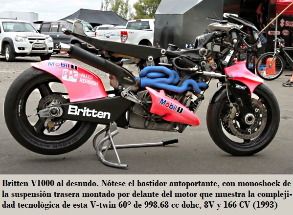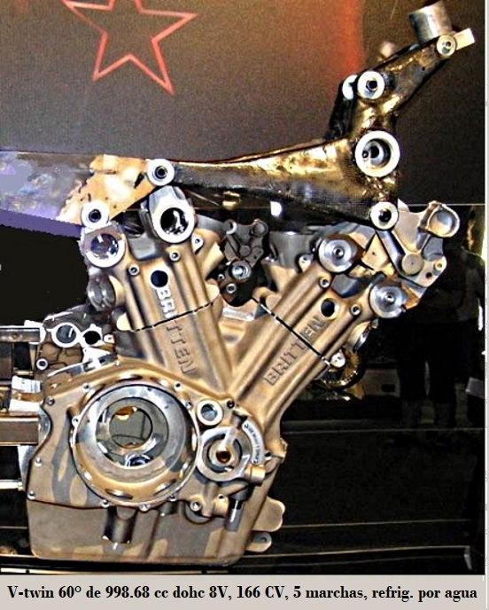Las máquinas de Britten fueron construidas a mano y montadas alrededor de su propio motor bicilíndrico 60E V de 1000 cc. Bellamente diseñada, posee un motor ligero, muy fuerte, increíblemente suave y potente para un bicilíndrico en V. El motor - alma y corazón de la Britten - fue el punto de partida de todas las decisiones relativas a su diseño externo. La más radical de todas las decisiones de Britten fue no usar un chasis convencional. En su lugar, utilizando Kevlar y fibra de carbono, todo, desde el asiento y las ruedas hasta la suspensión, estaba atornillado al motor, que se convertía en la unidad central de esfuerzo. El propio asiento es sencillamente una viga de fibra de carbono que se extendía hasta la parte trasera desde la culata del cilindro. En realidad, la suspensión trasera está montada delante del motor, y conecta detrás con un basculante - también un composite - mediante una larga bieleta. Su intención era concentrar el mayor peso posible alrededor del motor, para conseguir una moto compacta y de fácil manejo.