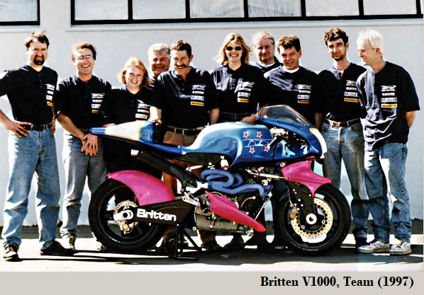 La mundialmente famosa Britten V1000 evolucionó a partir de tres diseños precursores en los que John y sus compañeros de mentalidad mecánica habían estado trabajando desde 1985. Los dos primeros ganaron las pruebas de velocidad BEARS (británicas, europeas, americanas y aficionados) en Canterbury, Nueva Gales del Sur, en 1987, 1989 y 1990, alcanzando velocidades de 247,80 km/h.