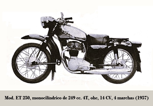 • ET 250: de 249 cc distribución ohc, 14 CV / 5 500 rpm, cadena transmisión carenada, bastidor simple cuna desdoblado, suspensión D/T horquilla telescópica leading link tipo Earles / basculante con dos amortiguadores hidráulicos, velocidad máxima 110 km/h y 155 kg de peso. 1957