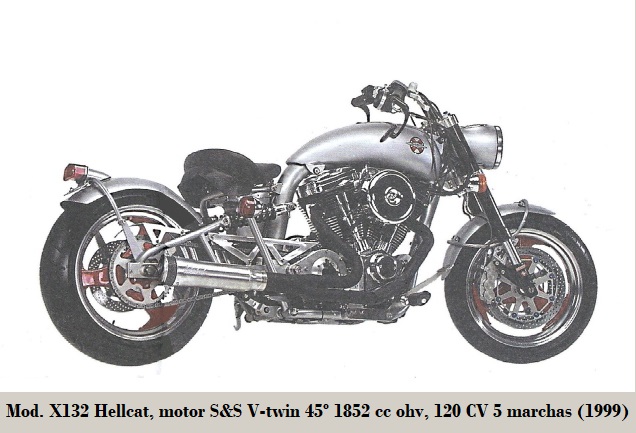 • Hellcat: V-twin a 45º de 1.852 cc, 120 CV, asiento biplaza, suspensión D/T {horquilla invertida Paoli} ø 48 mm / cantilever con monoshock, escape 2 en 1; el segundo disco delantero y el tacómetro opcional. 1994