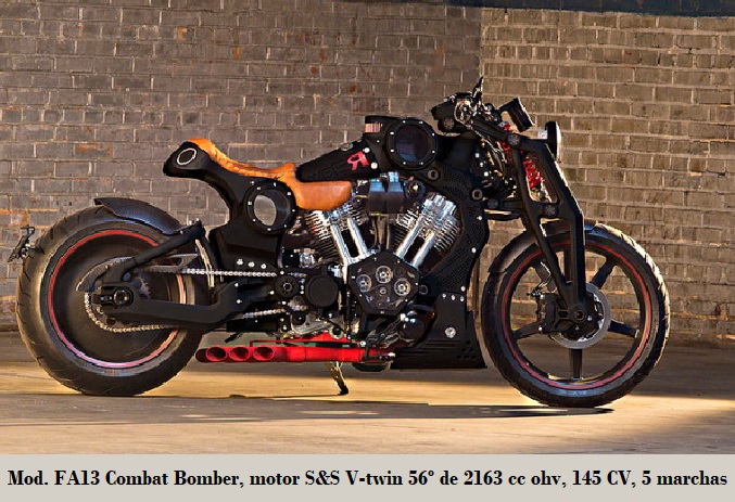 • Bomber FA13: V-twin a 56º de 2163 cc, 145 CV / 5 100 rpm, velocidad máxima 258 km/h. tanque de combustible 16 L, llanta de disco trasera; resto igual