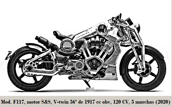 • Fighter F117: V-twin a 56º de 1917 cc, 120 120 CV / 5 100 rpm, neumáticos D/T 120 - 70ZR19 / 240 - 45ZR17, batalla 1.586 mm, capacidad combustible 16.25 L y escape / silencioso con salida por debajo del sillín.