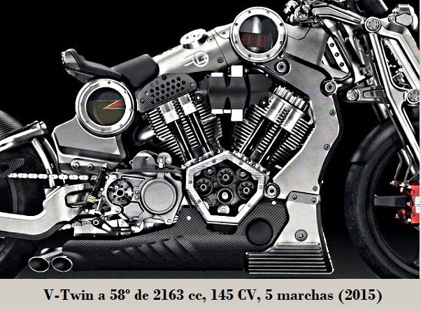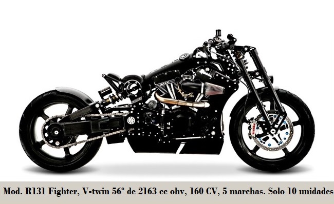 • Fighter R131: V-twin a 56º de 2163 cc, 160 CV, frenos de disco cerámicos Brembo de 4 pistones de carbono, batalla 1626 mm, tanque 17 L (4.2 L, aceite) y 208 kg. Producción únicamente 10 unidades