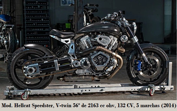 • Hellcat Speedster: V-twin a 56º de 2163 cc, 132 CV, suspensión D/T horquilla invertida Marzocchi RAC de ø 50 mm / cantilever con monoshock, frenos de disco Beringer D/T (2) ø 300 / ø 280 mm, neumáticos radiales Pirelli Diablo Rosso D/T 120 - 70ZR / 190 - 55ZR, tanque 17 L y 226 kg de peso.