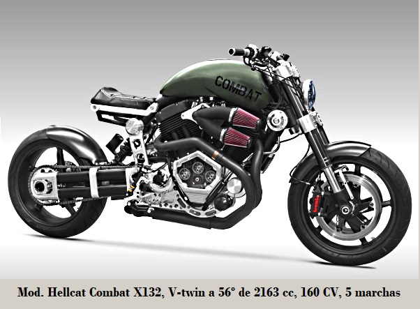 • Hellcat Combat X132: V-twin a 56º de 2163 cc, 160 CV, frenos de disco Beringer o Brembo D/T ø 300 / Brembo ø 280 mm, neumáticos Pirelli Diablo Rosso D/T 120 - 70ZR / 190 - 55ZR, tanque 17 L y 226 kg de peso