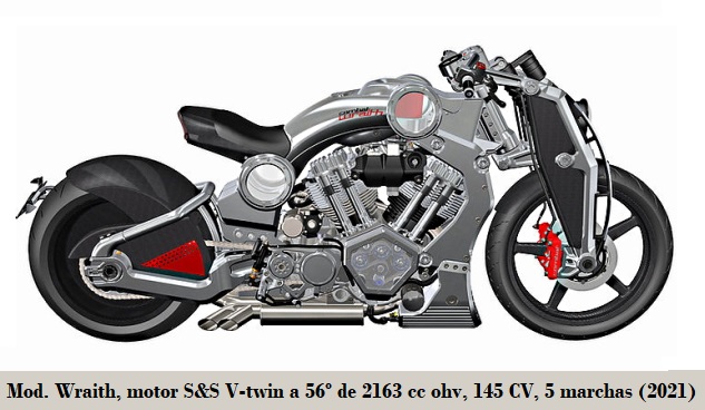 Todos equipados con motor S&S V-twin con distribución ohv, 5 marchas, {bastidor monocasco tubular} de ø 7" que hace las funciones de tanque de combustible como el de aceite, suspensión D/T doble horquilla con monoshock / cantilever con monoshock, llantas de carbono D/T ø 19" / ø 17", transmisión final por cadena