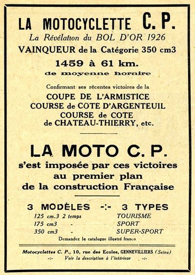 Los Sres Couégnas y Poisson se asociaron, en 1924 constituyendo la firma "Motocyclettes CP", con sede en el 10, Rue des Écoles, Gennevilliers, departamento del Sena. dedicándose a la fabricación de bastidores y secundariamente de motocicletas