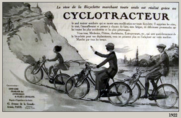 La firma "Compagnie Française des Automobiles De Place", con sede en el 2, Place Collange, Levallois-Perret, departamento del Sena, presentó en el Salón de Paris de 1913, un motor auxiliar para montar en cualquier tipo de bicicleta.