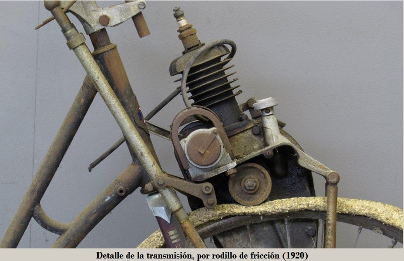 El motor se montaba sobre la rueda delantera siendo la transmisión mediante rodillo de fricción, con la particularidad que existían dos tipos de rodillo: uno acanalado para usar en seco y uno cubierto con "esmeril" para uso en mojado.
