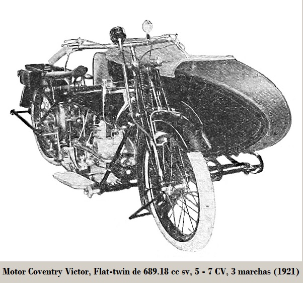 • Coventry-Victor, Flat-twin longitudinal de 689.18 cc sv, 5 - 7 CV, caja de cambios STURMEY-ARCHER pre-unit de 3 velocidades, carburador Amac de dos palancas, transmisión P/S cadenas y llantas Dunlop 65 x 650 mm; resto como las anteriores.