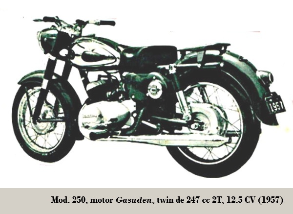 • 250: twin paralelo de 247 cc, 12,5 CV, bastidor simple cuna, suspensión hidráulica D/T telescópica / basculante con amortiguadores, frenos de tambor D/T. 1957