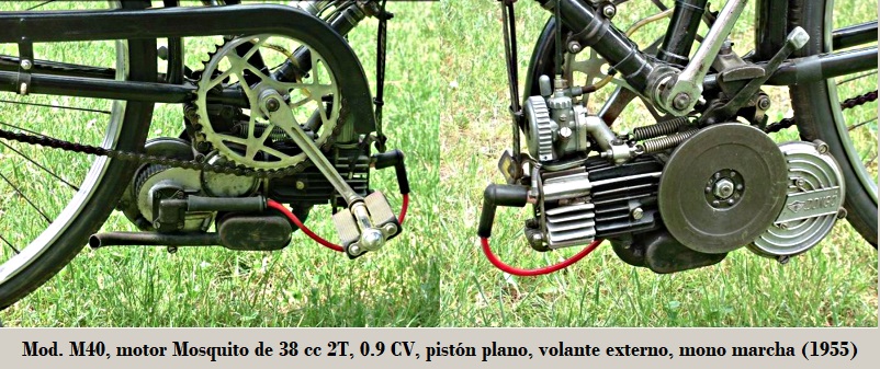 Se trataba de monocilíndricos de 38 cc 2T, 0.9 CV / 4 000 rpm, mono marcha, volante motor externo, encendido por magneto, capacidad ascensional 6% (sin pedaleo), tanque de 2.3 L, consumo de 1.17 L/100 km y peso de 6 kg.