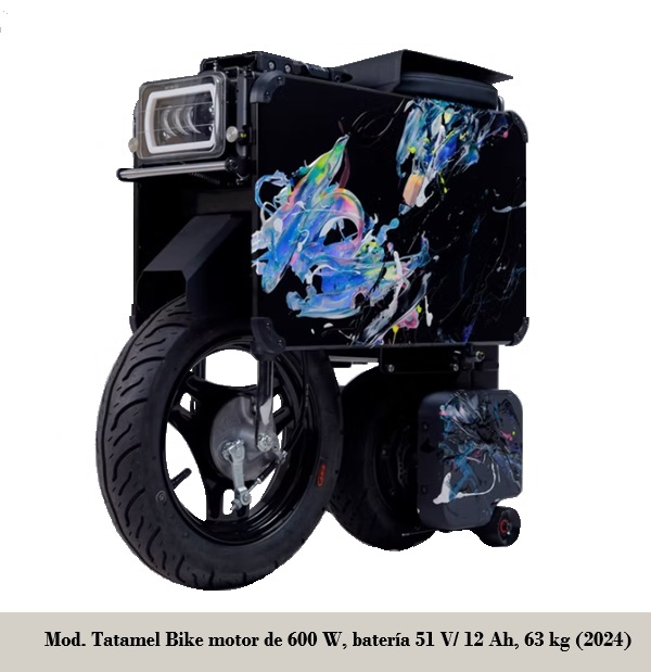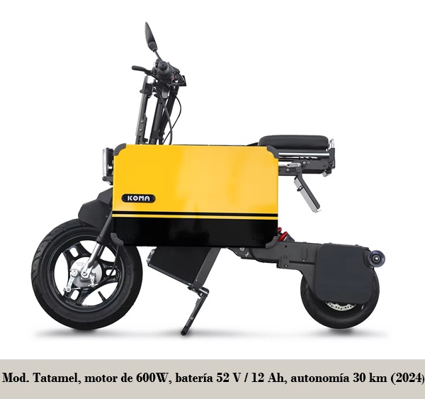 Ciclomotor plegable con motor eléctrico de 600 W, batería de fosfato de hierro y litio 51.2 V / 12 Ah aprox. 0.6 kW/h (vida 2000-3000 ciclos), autonomía ≦ 30 km (con una carga completa), suspensión D/T horquilla telescópica / monoshock, ruedas D/T ø 10" / ø 6.5 ", frenos de tambor D/T, velocidad máxima ≦ 45 km/h y 63 kg; equipado con salida USB.