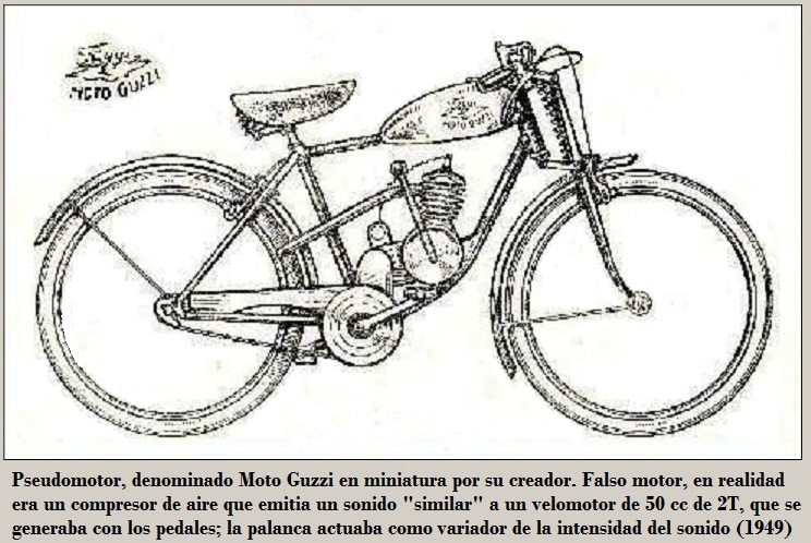 Cabe mencionar que fabricaron un motor auxiliar, que denominaron "Pseudomotor" ya que realmente no era más que un compresor de aire, que "simulaba" el sonido de un 50 cc 2T, que funcionaba por el movimiento del eje de los pedales y mediante una palanca podían obtenerse diversas tonalidades de ruido, análogas al escape de un velomotor; el falso tanque, la horquilla elástica y el manillar "racing" le daban el aspecto de verdadero vehículo a motor.