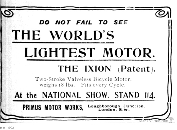 La firma "Primus Motor Works", con sede en Loughbrough Junction, Lambeth, en 1902 fabricó una motocicleta bajo el nombre de PRIMUS, máquina muy rudimentaria, que en realidad era una bicicleta, sin modificaciones ni refuerzo alguno, equipada con motor.