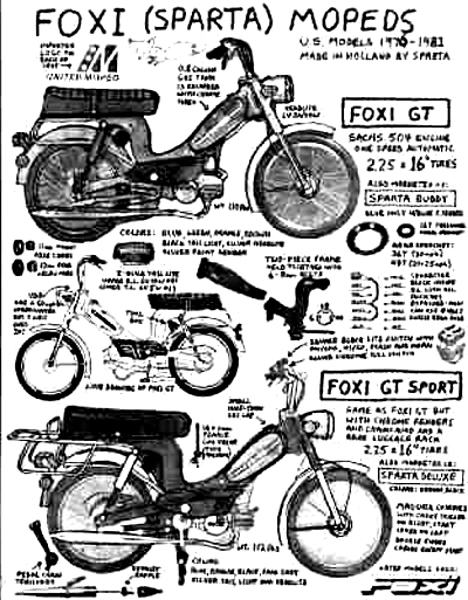 Antes que nada aclarar lo siguiente: Los EE.UU. han tenido dos tipos de ciclomotores SPARTA, - FLYING DUTCHMANN y FOXI - con bastidor de chapa de acero estampado, soldadas entre sí por la costura central, y ambos equipados con motor SACHS 504/1A de 47 cc de 2T (en versiones de 45 km/h o 25 km/h).