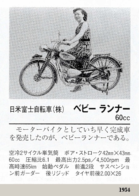 A partir de ese año importaron o produjeron localmente varios ciclomotores y motocicletas ligeras bajo las marcas Baby Runner (ベビーランナー号) y Fuji (フジ号). A finales de ese mismo año, la marca Baby Runner fue desarrollada y vendida específicamente por una nueva empresa llamada "Aichi Kikai Co., Ltd.", con sede en Taitō-Ku, Tokyo.