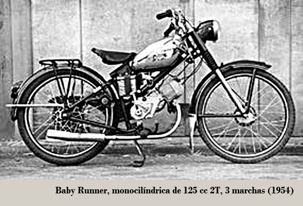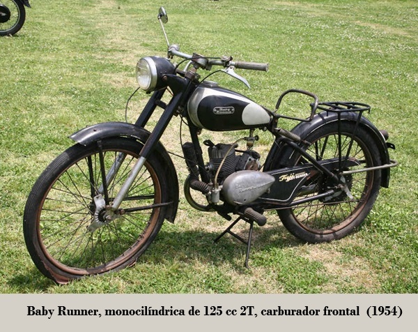 • Mod. 60: de 59.6 cc, 2.5 CV / 4 500 rpm, bastidor monoviga, suspensión D/T horquilla de paralelogramos de acero estampado / rígida, neumáticos D/T 2.00 x 26", montaban el carburador en posición frontal