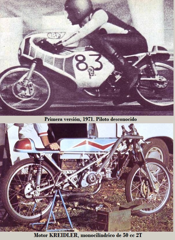 En 1971 comenzaron con una máquina similar a una KREIDLER, equipada con motor DRM Kreidler de 50 cc, de 18 CV, carburador Amal o Gurtner, caja de cambios de 6 velocidades, montado en un bastidor copia fiel de los SEELEY, horquilla Marzocchi y freno Fontana.