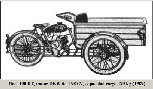 - Mod. 100 RT: motor Dkw de 4.93 CV, capacidad de carga 120 kg. 1939