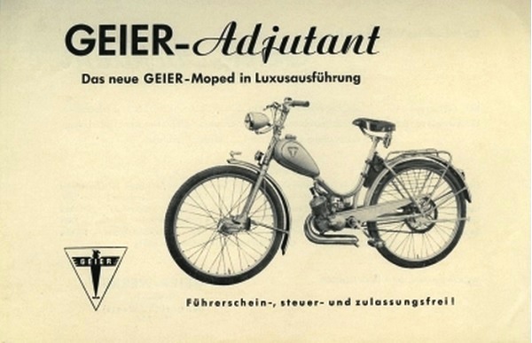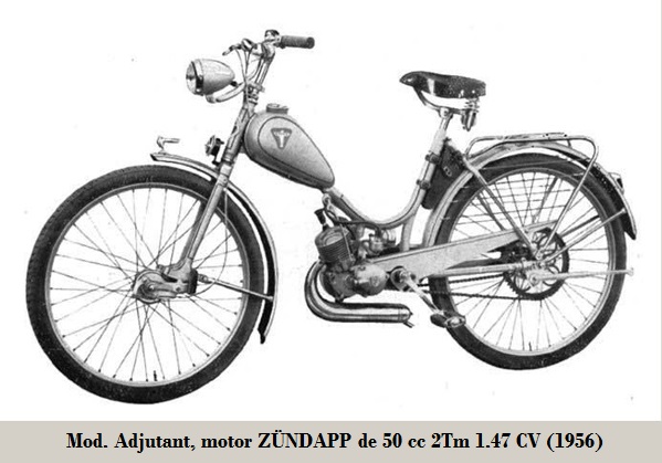- Adjutant Luxus: motor ZÜNDAPP ¹ de 50 cc, 1.47 CV, frenos de tambor D/T, neumáticos 2.00 - 26", tanque 5.0 L (consumo 1.25 L/100 km) y 33 kg de peso. 1956