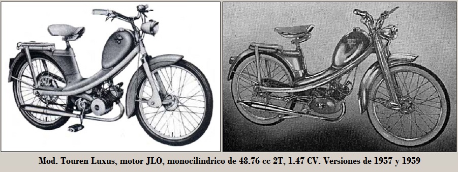 - Touren Luxus: motor JLO de 48.76 cc, de 1.47 CV, monomarcha, embrague multidisco en baño de aceite carburador Bing ó Pallas, encendido por volante magnético 6 V / 3 W, bujía Bosch W 175 T11. 1957
