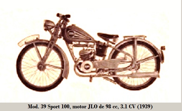 - Mod. 39 Sport: de 98 cc, 1.18 CV, encendido por magneto de 15 W, suspensión D/T horquilla de paralelogramos / rígida, velocidad 60 km/h, tanque 14 L (consumo 2.0 L/100km). 1939