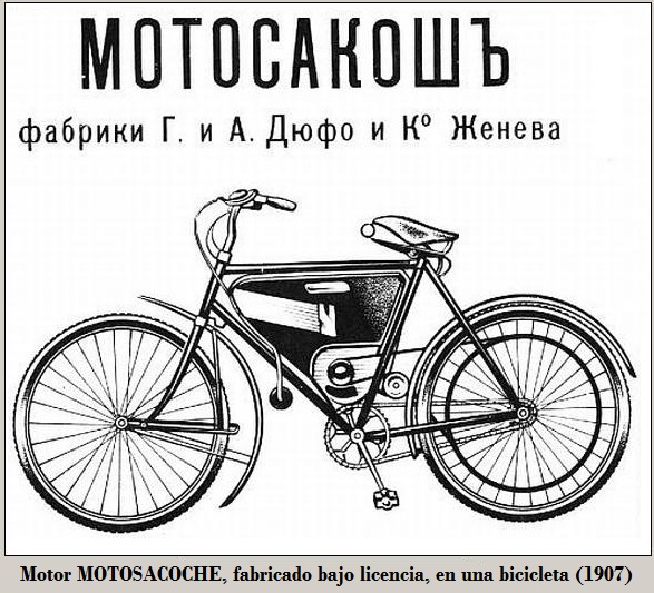 Motor monocilíndrico de la firma MOTOSACOCHE fabricado bajo licencia, en la ciudad de Moscú. Montado en el interior del cuadro de una bicicleta, equipada con un primitivo sistema de horquilla delantera con un anclaje inferior tipo leading link, con aspecto similar a lo que más adelante se conoció por Earles.