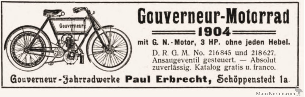 Paul Erbrecht, responsable de la "Gouverneur Fahrradwerke", con sede en Schöppenstedt, en el estado de Baja Sajonia, fue una firma germana poco conocido en la época del Kayser, que ensamblaba sus motocicletas con motores GN MOTOR de 3.5 CV, durante los años 1903 hasta 1907...