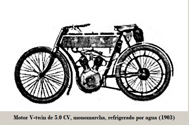 Apareció otro modelo, con motor V-twin - también refrigerado por agua - de 5.0 CV, con el motor montado en un bastidor tipo loop frame, arranque manual, y pedal de embrague.