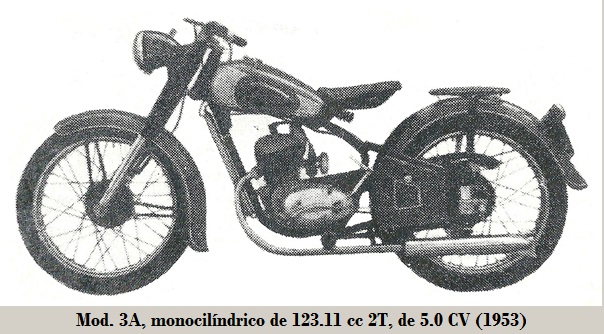 Fabricaron 10 unidades, del modelo 3A; motocicleta de 123.11 cc 2T, de 5.0 CV / 4 800 rpm, carburador Dell´Orto de ø 17 mm, caja de cambio de 3 velocidades, bastidor simple cuna, suspensiones D/T horquilla telescópica hidráulica / amortiguadores hidráulicos, velocidad máxima de 70-75 Km/h.