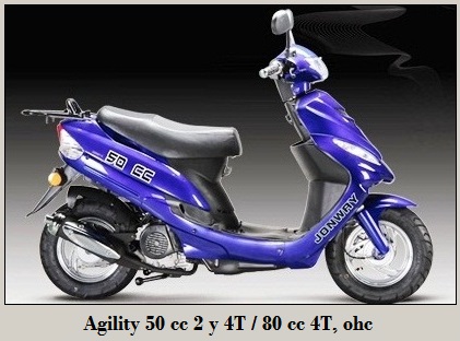 - Agility (YY50QT-6): de 50 cc de 2T y 4T ohc, 4.0 CV / 8 000 rpm, neumáticos D/T 3.50 x 10, velocidad máxima 70 km/h, tanque 4.40 L y 84 kg de peso.