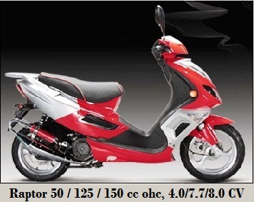 - Raptor (YY50QT-28): de 50 cc 2T, 4.0 CV / 8 000 rpm, frenos D/T disco / tambor, neumáticos D/T 130 - 70-12", velocidad 70 km/h, tanque de 4.20 L y 95 kg.