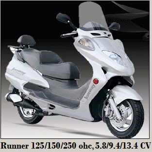 - Runner (YY250T-2): de 250 cc, 13.4 CV / 7 500 rpm, velocidad 120 km/h, solo arranque eléctrico, neumáticos D/T 120 - 70-12" / 120 - 90-10"; resto igual al modelo (YY125T-2).