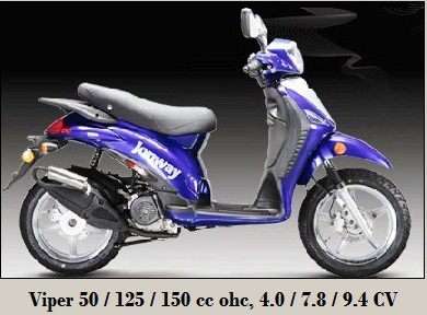 - Viper (YY125T-10): de 125 cc de 2T y 4T ohc, 7.8 CV / 8 500 rpm, frenos D/T disco / tambor, velocidad 90 km/h y 120 kg; resto como la versión anterior.