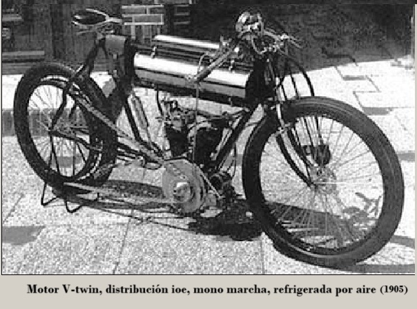 Motocicleta de competición, con motor V-twin, distribución ioe, mono marcha, refrigerada por aire, transmisión por correa a la rueda trasera, freno de llanta delantero - como el usado en las bicicletas - tanque tipo réservoir plat torpedo y equipada con velocímetro (!)