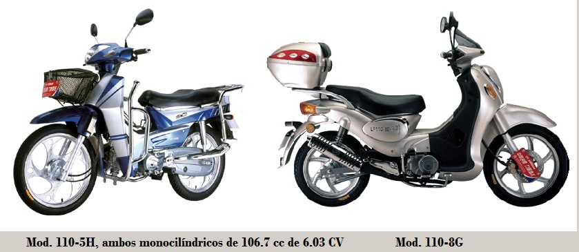 • LF110-5H: de 106.7 cc, 6.03 CV, frenos de tambor D/T, llantas de aluminio D/(T 16” / 1142, velocidad 80 km/h, portaequipajes trasero, cesta delantera y 80 kg de peso