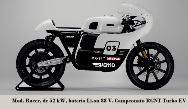 • Turbo Racing: de 52 kW (69.7 CV), batería Li-on de 88 V, potencia 7.5 kW/h, autonomía 150 km, carga 1 h (100%), velocidad máxima 180-190 km/h, aceleración 0-100 km/h en 4 segundos; en colaboración SVEMO (Asociación Sueca de Automovilismo), Motorrad Bike y Dunlop, para competir en el Campeonato RGNT Turbo EV, siendo este un evento de categoría económica para iniciarse en las carreras de motos eléctricas.