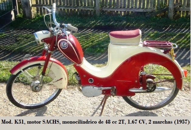 - K51: 1.67 CV/4 100 rpm, 2 marchas, embrague de 2 discos de corcho, compresión 6.0:1, volante magnético 6 V/ 3 W, bujía Bosch W 240 T11 S, frenos de tambor D/T ø 90 mm, llantas D/T 2.00 x 23", tanque 1.3 L (reserva 0.7 L) consumo 1.3 L/100 km, mezcla al 4%, transmisión final por cadena y 45 kg. 1957 - 1958
