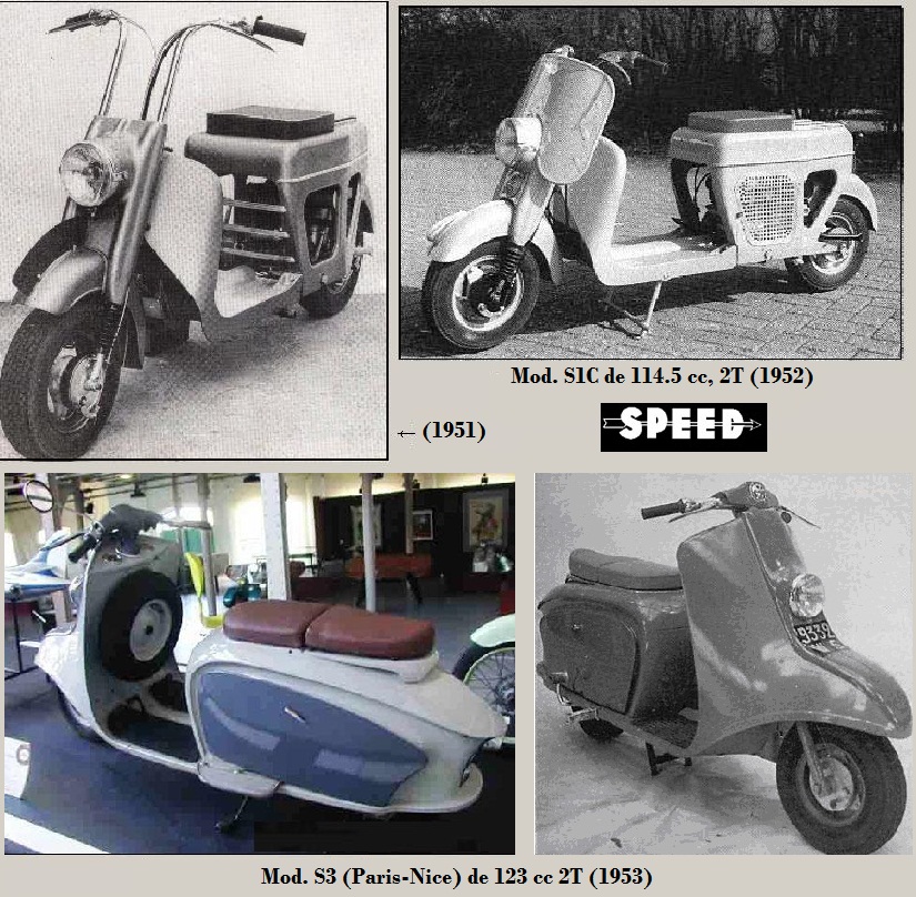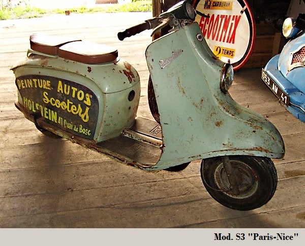 • Mod. S3 (Paris-Nice), escúter radicalmente diferente y mucho más avanzado, muy futurista, con cuerpo en forma de pájaro, fue diseñado por Jean Henri Labourdette. Monocilíndrico de 123 cc, 6.0 CV, 3 marchas (controladas por dos pedales, comandados por ambos pies), voltaje 6 V, ruedas D/T 4.00 x 8", suspensión D/T hidráulica con muelles, velocidad 75 km/h, tanque de 7.5 L, consumo 3.0 L/100 km y un peso de 95 kg. 1953-1955.