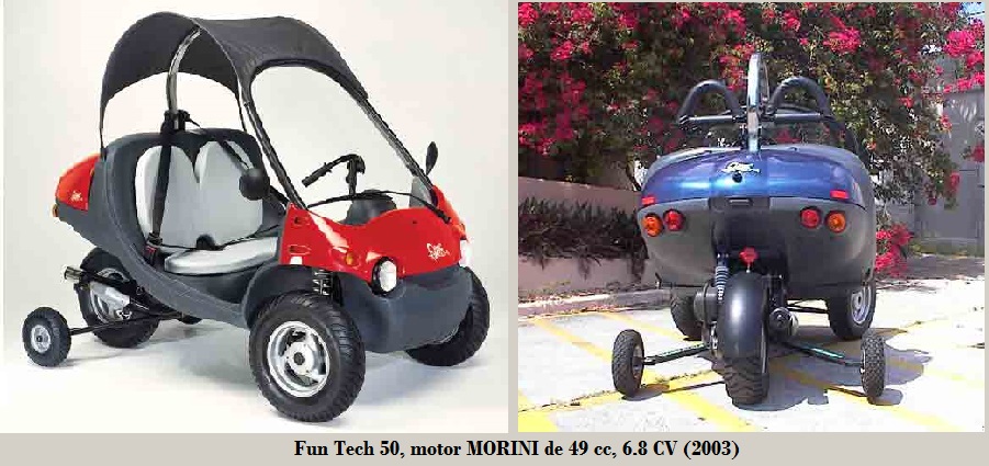 - Fun Tech 50: biplaza, tipo tadpole (aunque con dos pequeñas ruedas supletorias traseras), motor MORINI de 49 cc, de 6.8 CV, refrigerado por aire, batería 12V/14A, alternador 90 W, encendido electrónico, arranque eléctrico, velocidad máxima 45 km/h, embrague y transmisión automáticos, bastidor monocasco de polietireno reforzado, bastidor tubular de acero, barra antivuelco de acero, ruedas D/T 2 directrices / motriz (las 3 de 130-90 x 10"), suspensiones D/T MacPherson / cantilever con amortiguador regulable con Syncro balance system, cinturones de seguridad de 3 puntos de anclaje, parabrisas de vidrio laminado, frenos de tambor con repartidor de frenada, freno de estacionamiento, tanque 10 L (reserva: 1.7 L), volumen maletero 87 L y 146 kg de peso