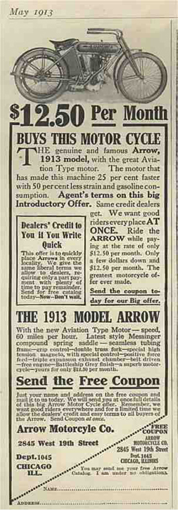 La "Arrow Motorcycle Co.", con sede en el 2845 West 19th Street, Chicago, Illinois, desde 1909 hasta 1914, ensambó motocicletas ligeras con motores monocilíndricos de 1.5 CV, suspensión delantera con ballesta y transmisión final mediante correa.