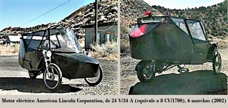 • Motor eléctrico American Lincoln Corporation, de 24 V/34 Amp, potencia equivalente a 8.0 CV/1 700 rpm, con suspensión, bastidor y ruedas delanteras procedentes de dos ciclomotores PEUGEOT de 1977, el resto del vehículo de tubo cuadrado de acero de 1/2" X1/16"