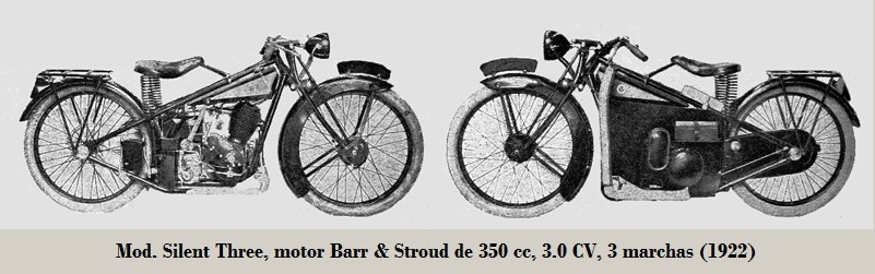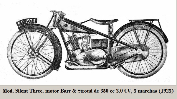 Fueron uno de los primeros en intentar reducir el ruido del motor. Presentando su primera máquina, en el Salón Olympia de noviembre de ese año, una motocicleta propia, denominada "Silent Three", con un motor con válvulas de camisa corredera de la marca BARR & STROUD de 350 cc de 3.0 CV, caja de cambios STURMEY-ARCHER pre-unit de 3 velocidades con embrague amortiguador, bastidor doble cuna, transmisión final mediante cadena completamente carenada con material de aluminio, frenos D/T de expansión interna, eje trasero patentado pudiendo extraer la rueda trasera sin tocar la cadena ni el freno; opcionalmente montaban una chapas que cubrían lateralmente el motor y escudos protectores de las piernas.