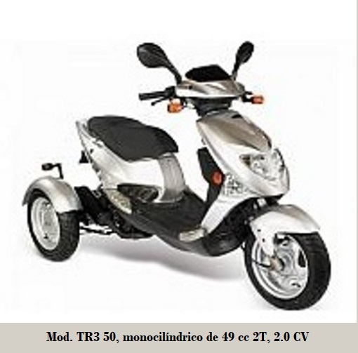 • TR3 50: de 49 cc, 2.0 CV / 5 500 rpm, Euro2, compresión 6.8:1, suspensión D/T horquilla telescópica trailing link / doble amortiguador ajustable, frenos D/T disco / (2) tambores, neumáticos D/T 120 - 70-12" / (2) 130 - 70-12", llantas de aluminio, transmisión final por correa, tanque 6.7 L y 124 kg. 2010