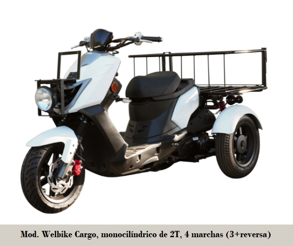 • Welbike Cargo: 4 marchas (3 + reversa), suspensión D/T horquilla trailing link telescópica / doble amortiguador ajustable, frenos de disco con ABS CBS D/T, freno de estacionamiento